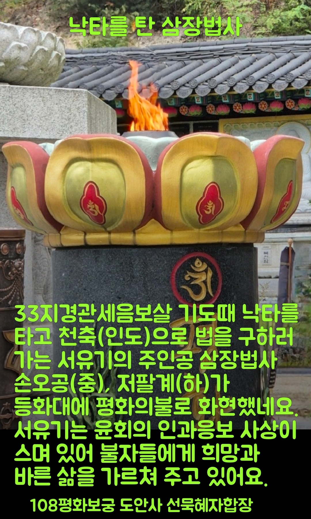 33관세음보살기도 7번째 지경관세음보살 기도때 평화의 불로 화현한 낙타를 탄 삼장법사, 손오공, 저팔계