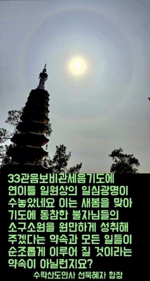 보비관세음보살기도때 나투신 일심광명 도안사 25-09-22 10:55 Hit : 171 목록 33관음기도중 보비관세음보살기도때 일심광명이 이틀동안 나투셨다 보비관세음보살은 중생에게 널리 자비를 베푸는 관세음보살이다. 이전글 다음글